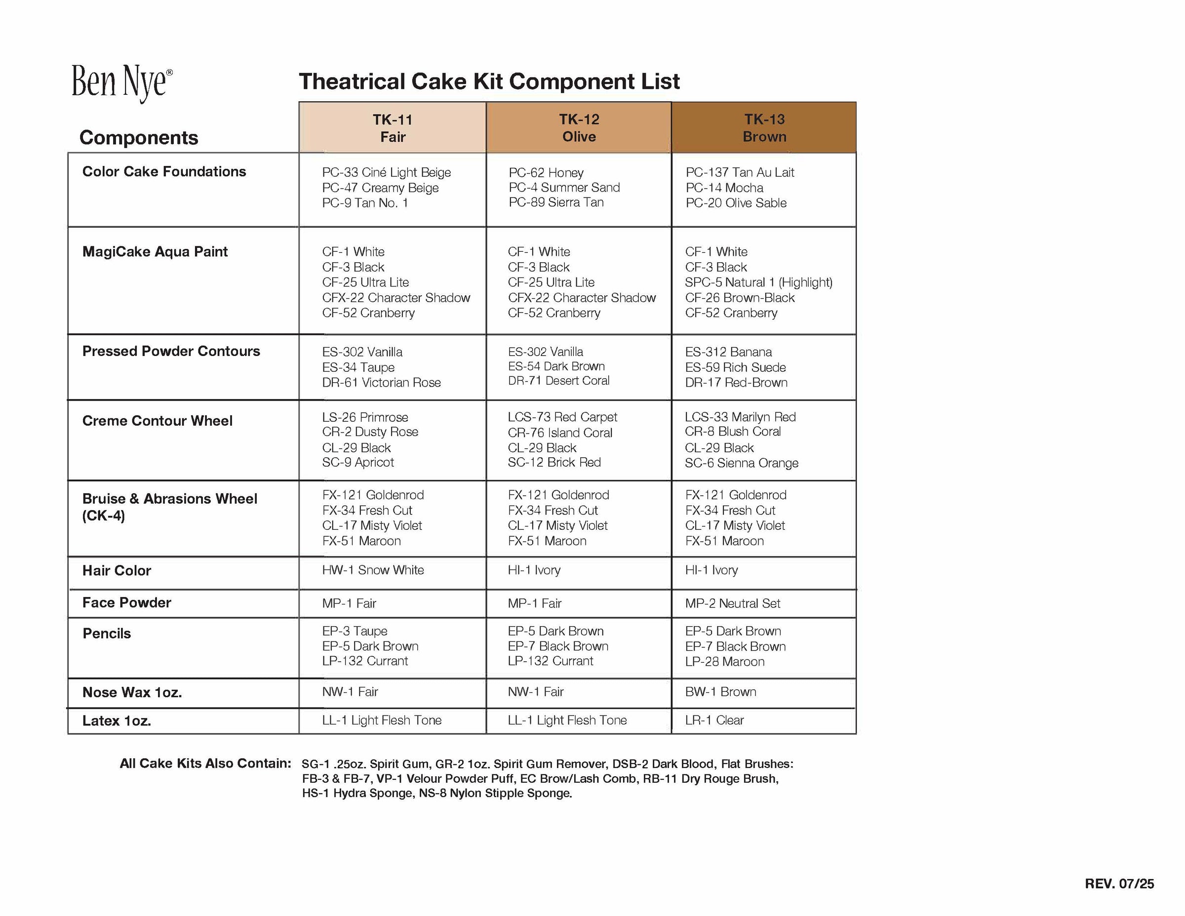 Cake Makeup Kits include water-activated Color Cake Foundations and MagiCake Aqua Paint contours, a generous range of products including creme contours and effects colors, plus useful accessories and tools. Three kits are designed to complement fair, olive, and brown complexions. This generous ensemble provides enough makeup for dozens of straight, beauty, and character designs.
